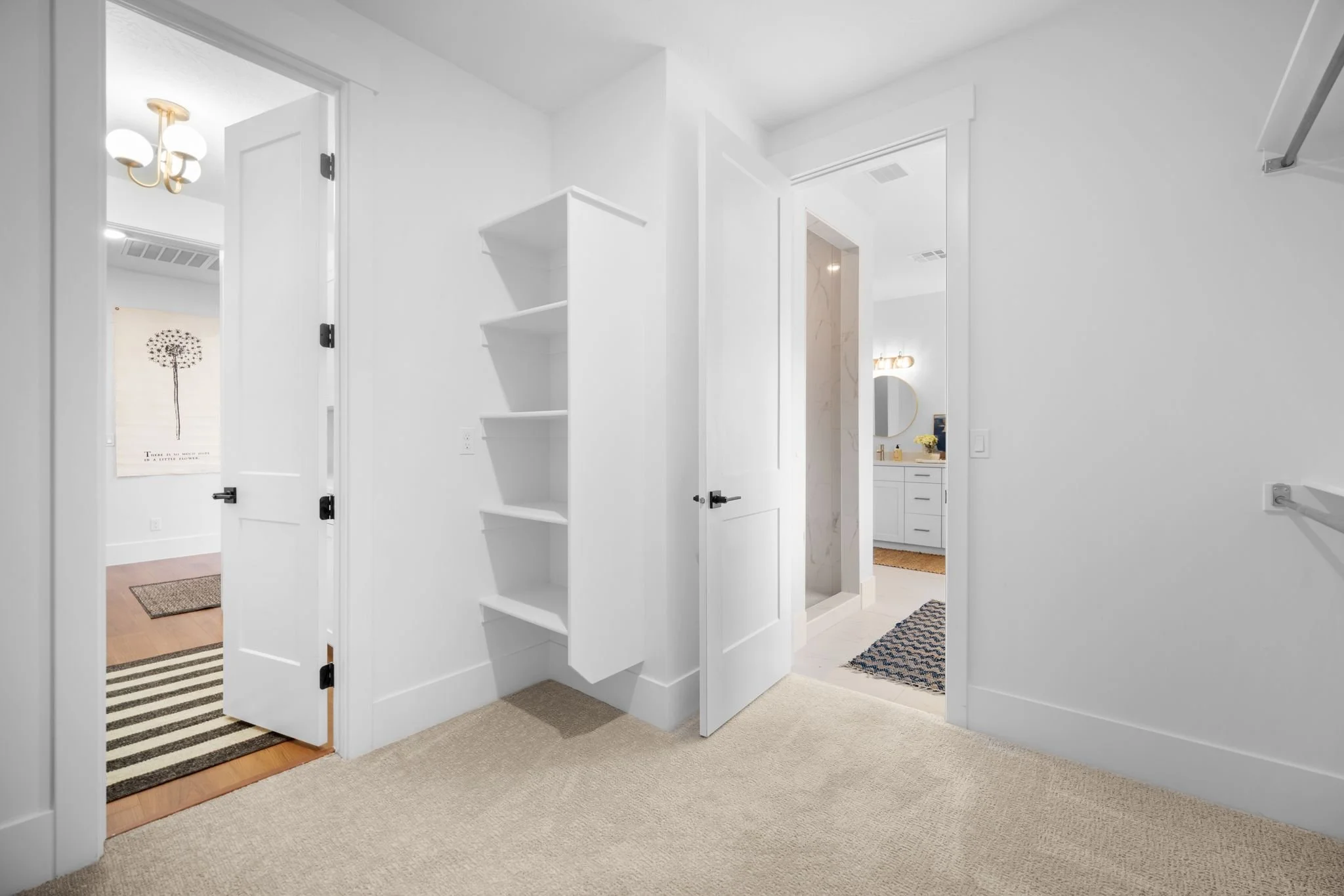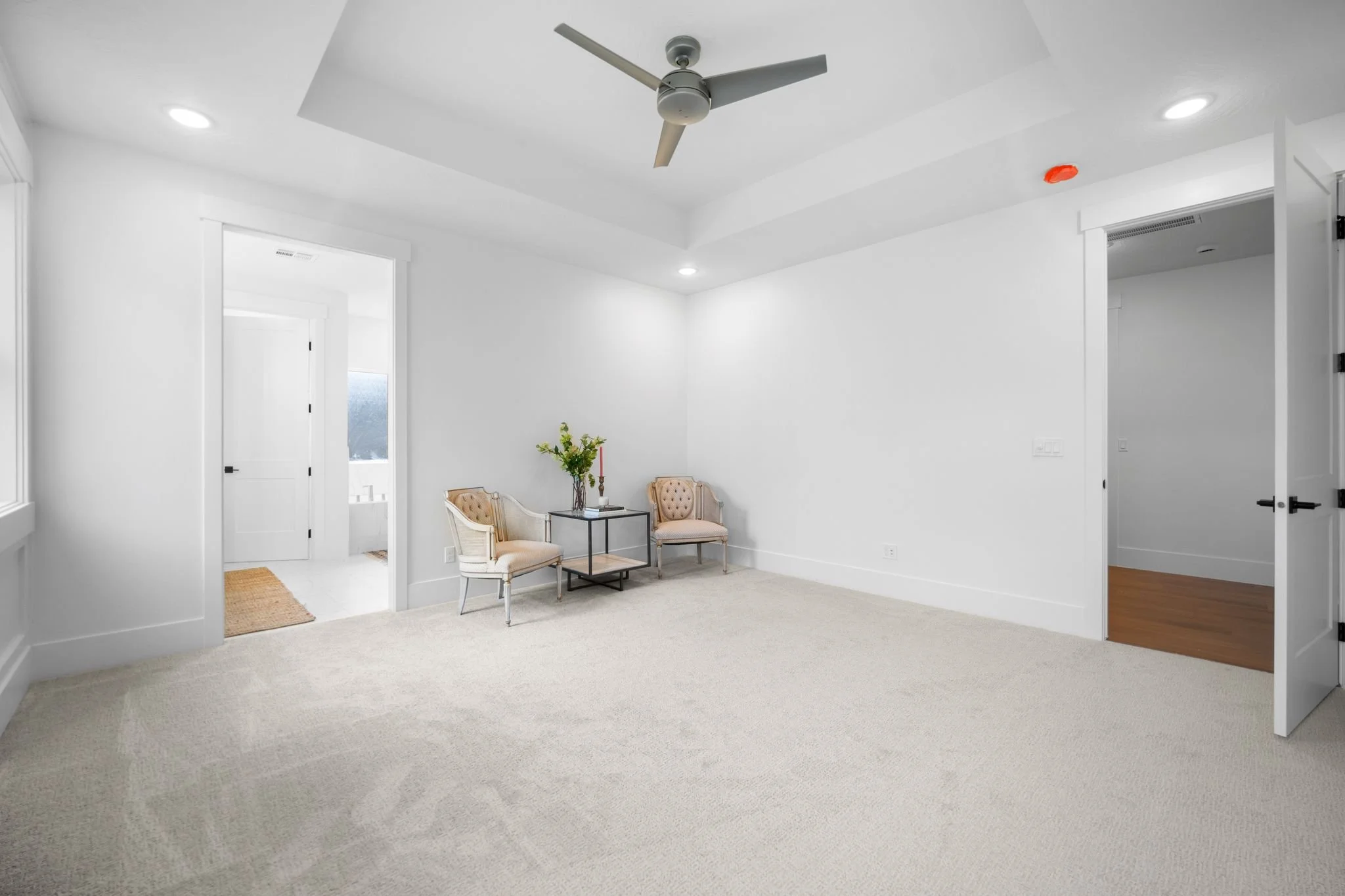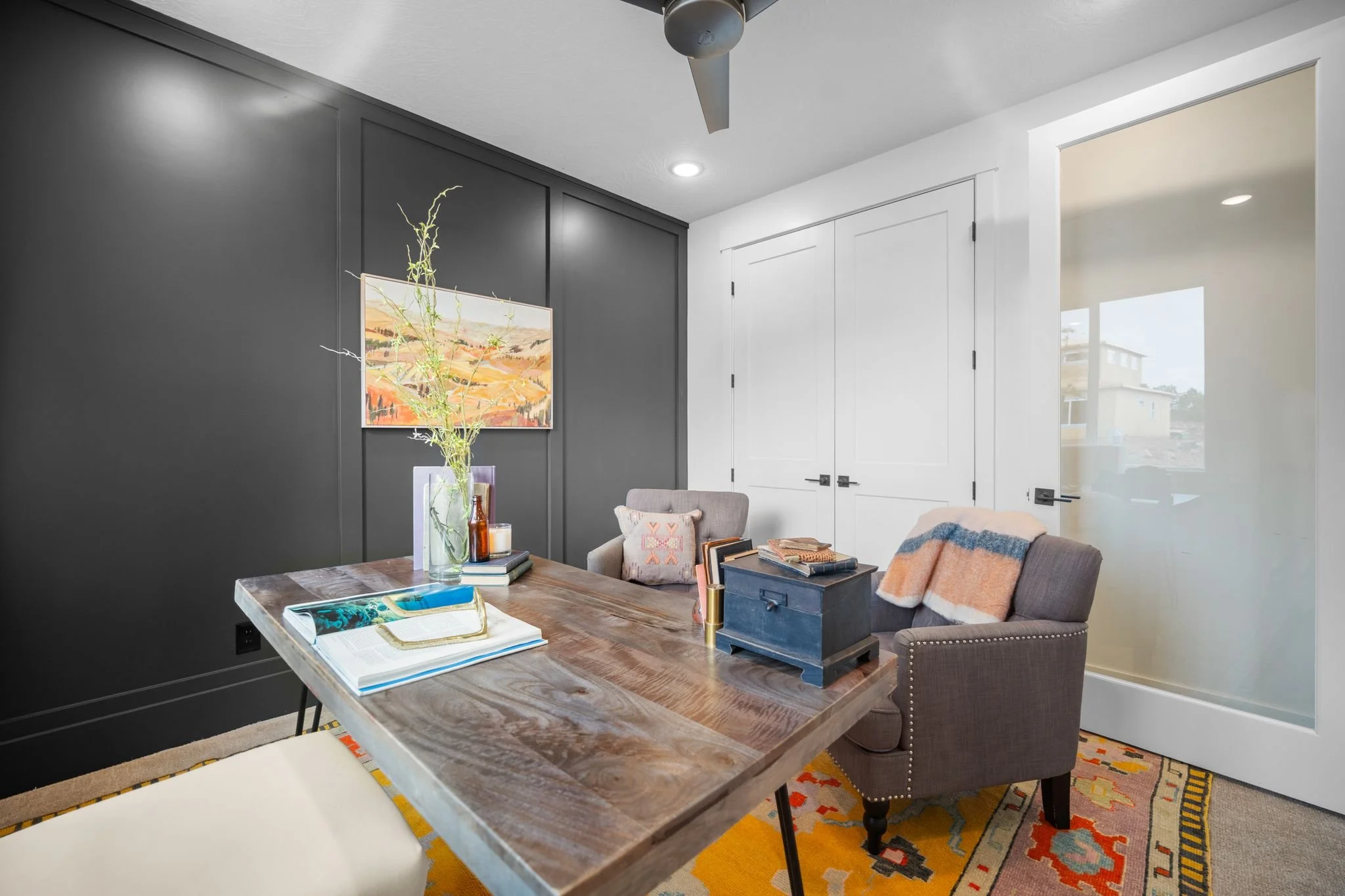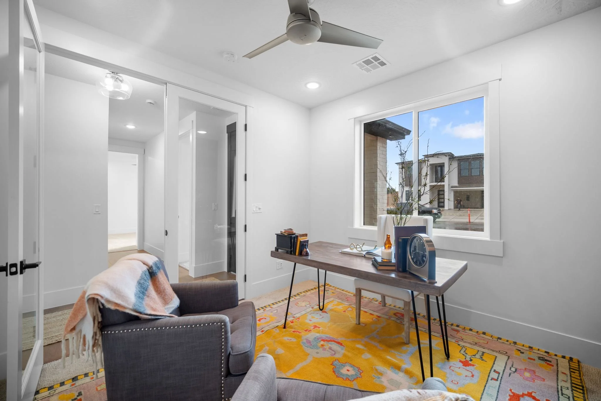 Three additional bedrooms offer plenty of space for family and guests with one configured as a home office featuring elegant glass French doors. A full secondary bathroom with a tiled tub and extra storage completes this side of the home.