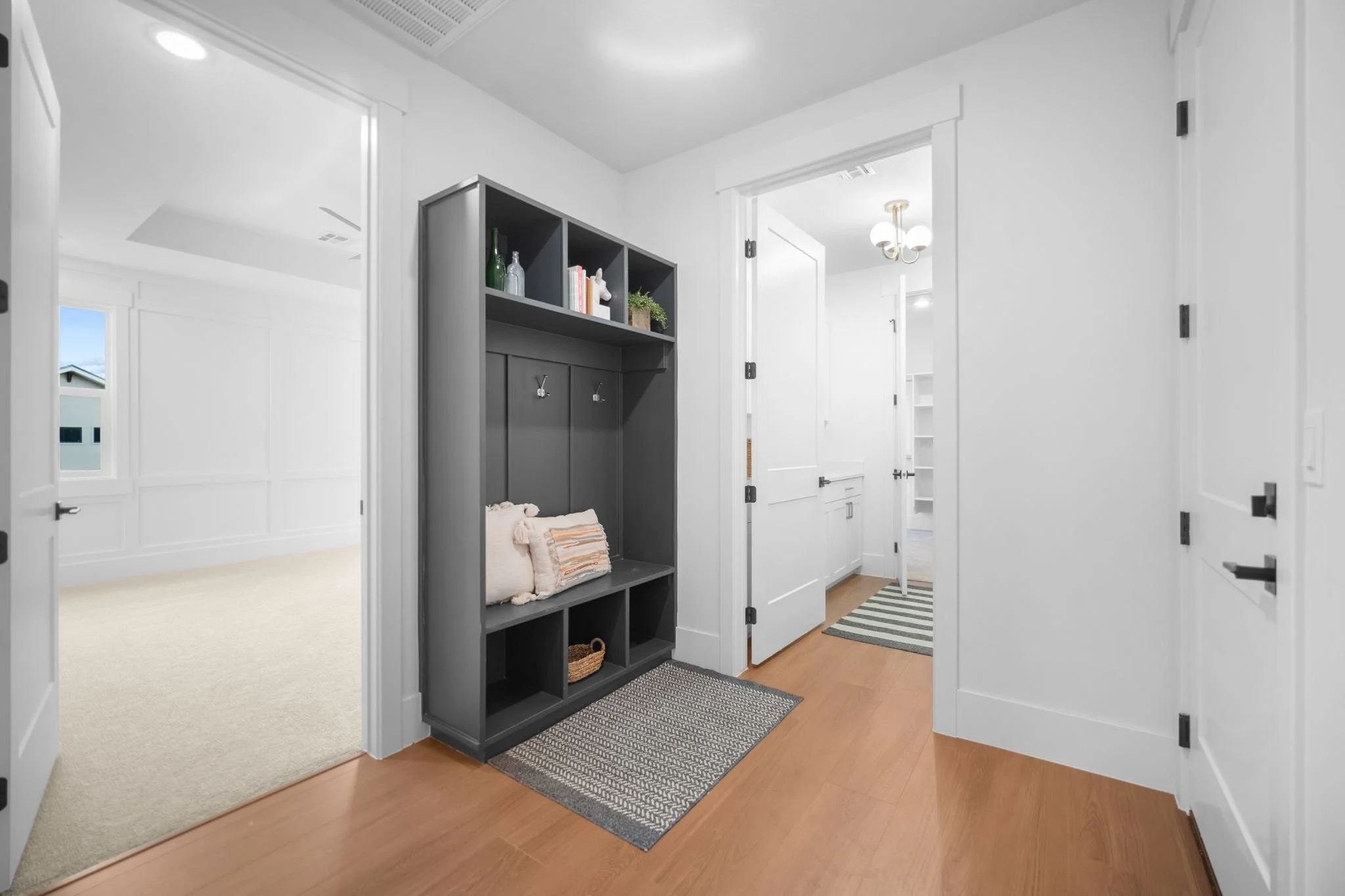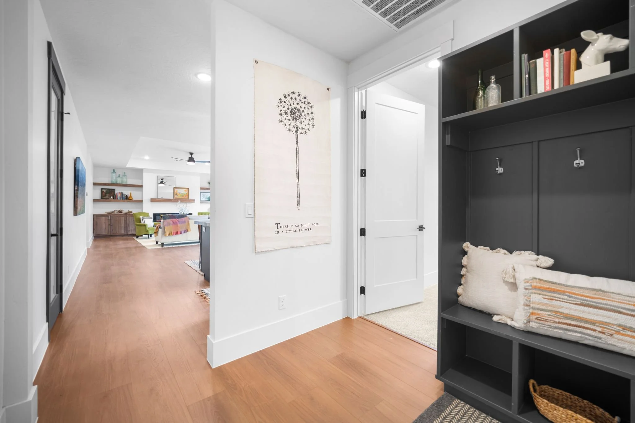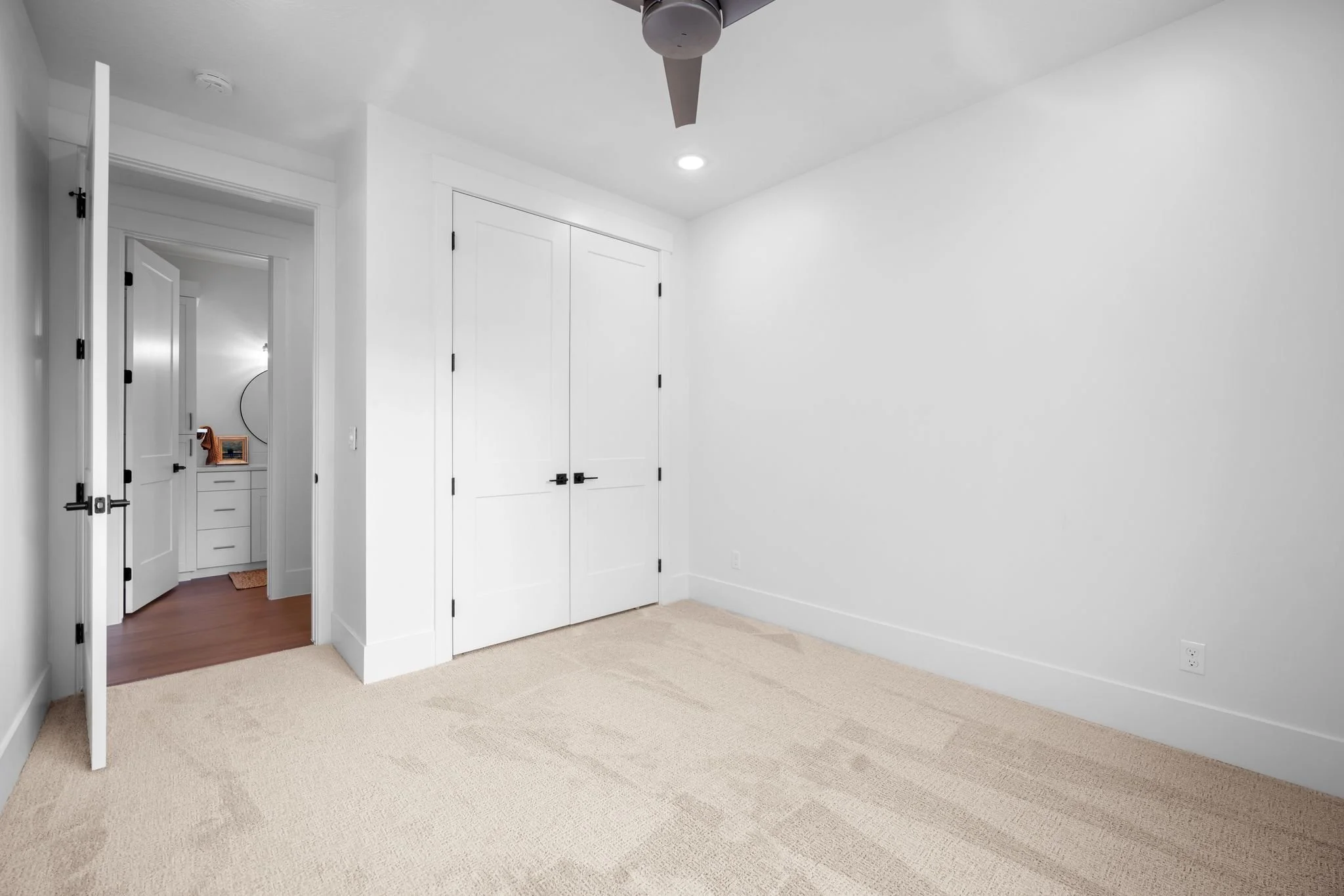 Three additional bedrooms offer plenty of space for family and guests with one configured as a home office featuring elegant glass French doors. A full secondary bathroom with a tiled tub and extra storage completes this side of the home.