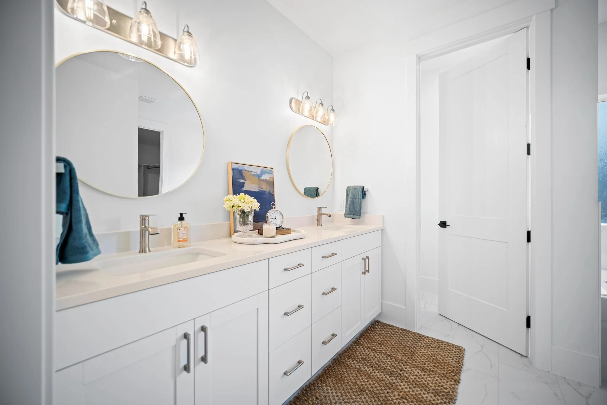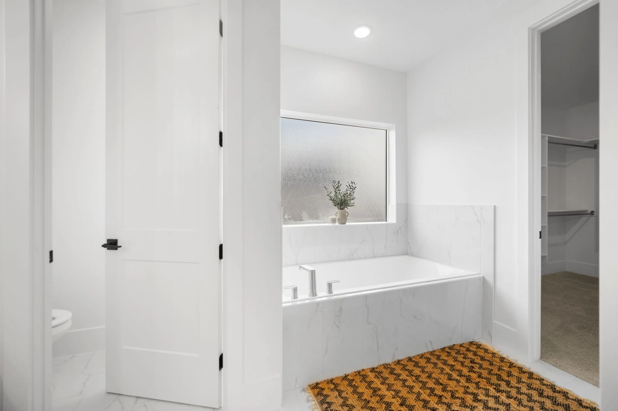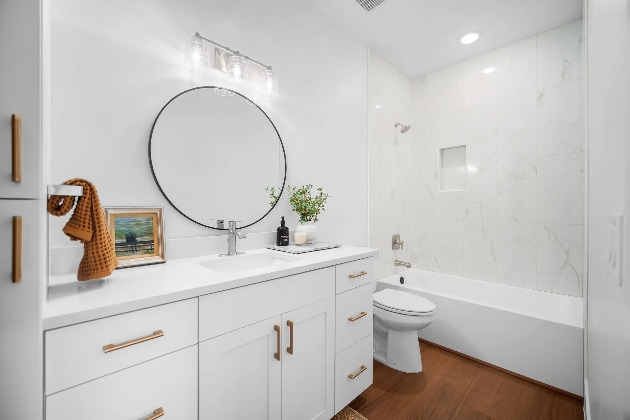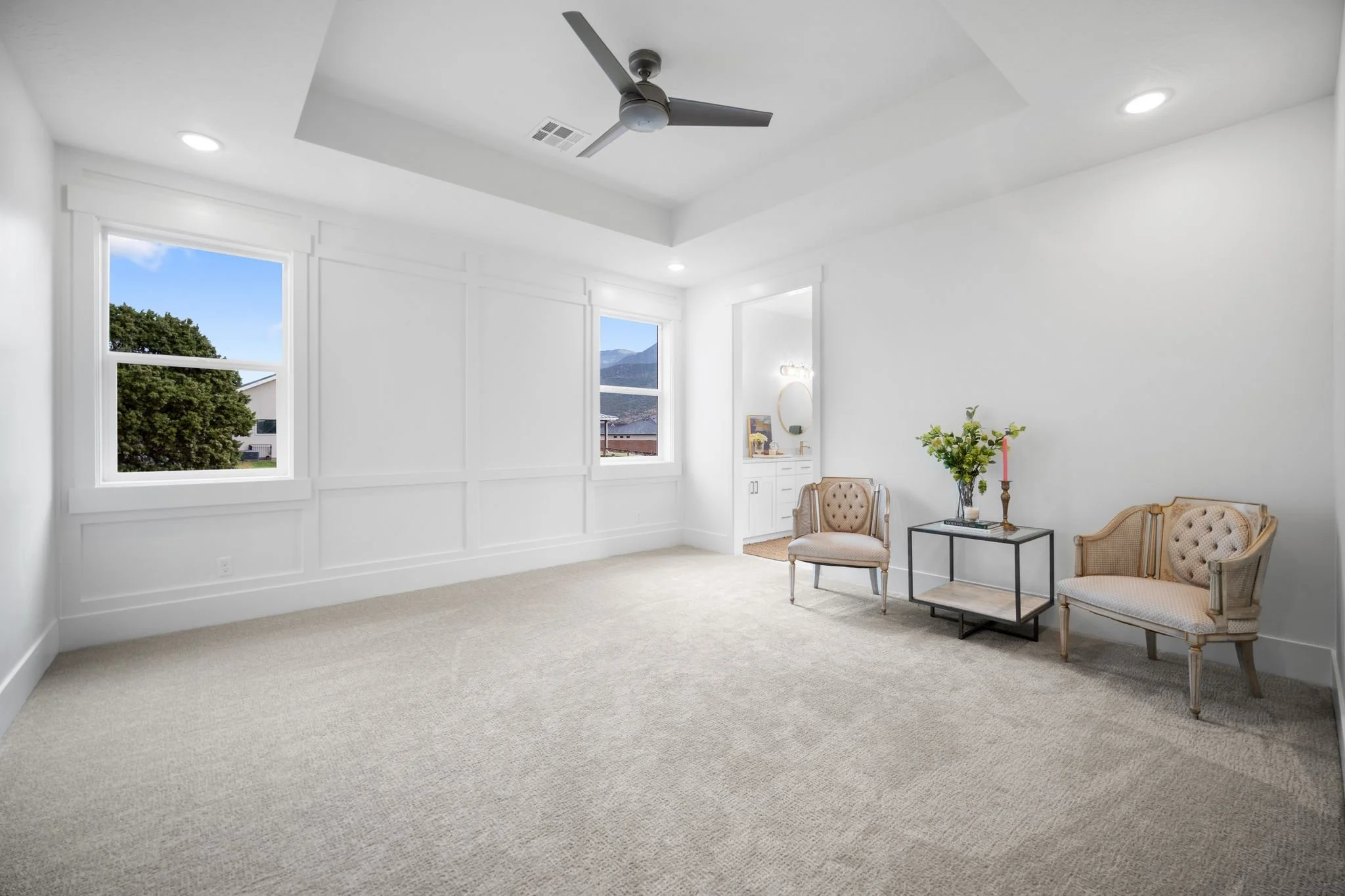 Three additional bedrooms offer plenty of space for family and guests with one configured as a home office featuring elegant glass French doors. A full secondary bathroom with a tiled tub and extra storage completes this side of the home.