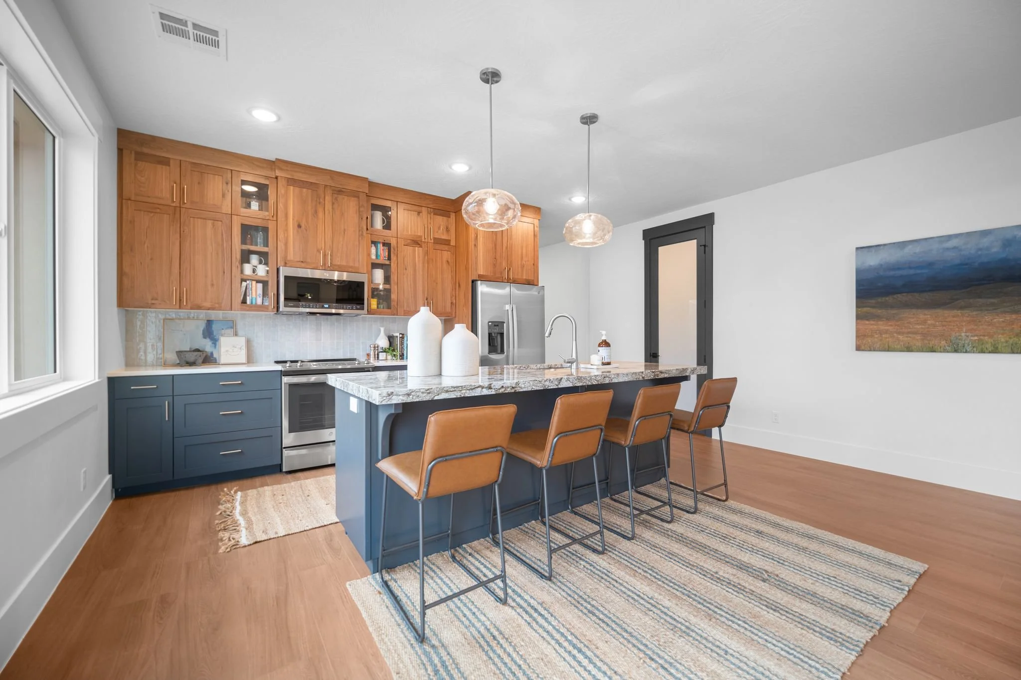 The kitchen boasts a large granite island and beautiful walnut cabinetry. It comes fully equipped with a range, microwave, refrigerator, dishwasher and disposal. The adjacent butler pantry with butcher block countertop provides additional storage and prep space.