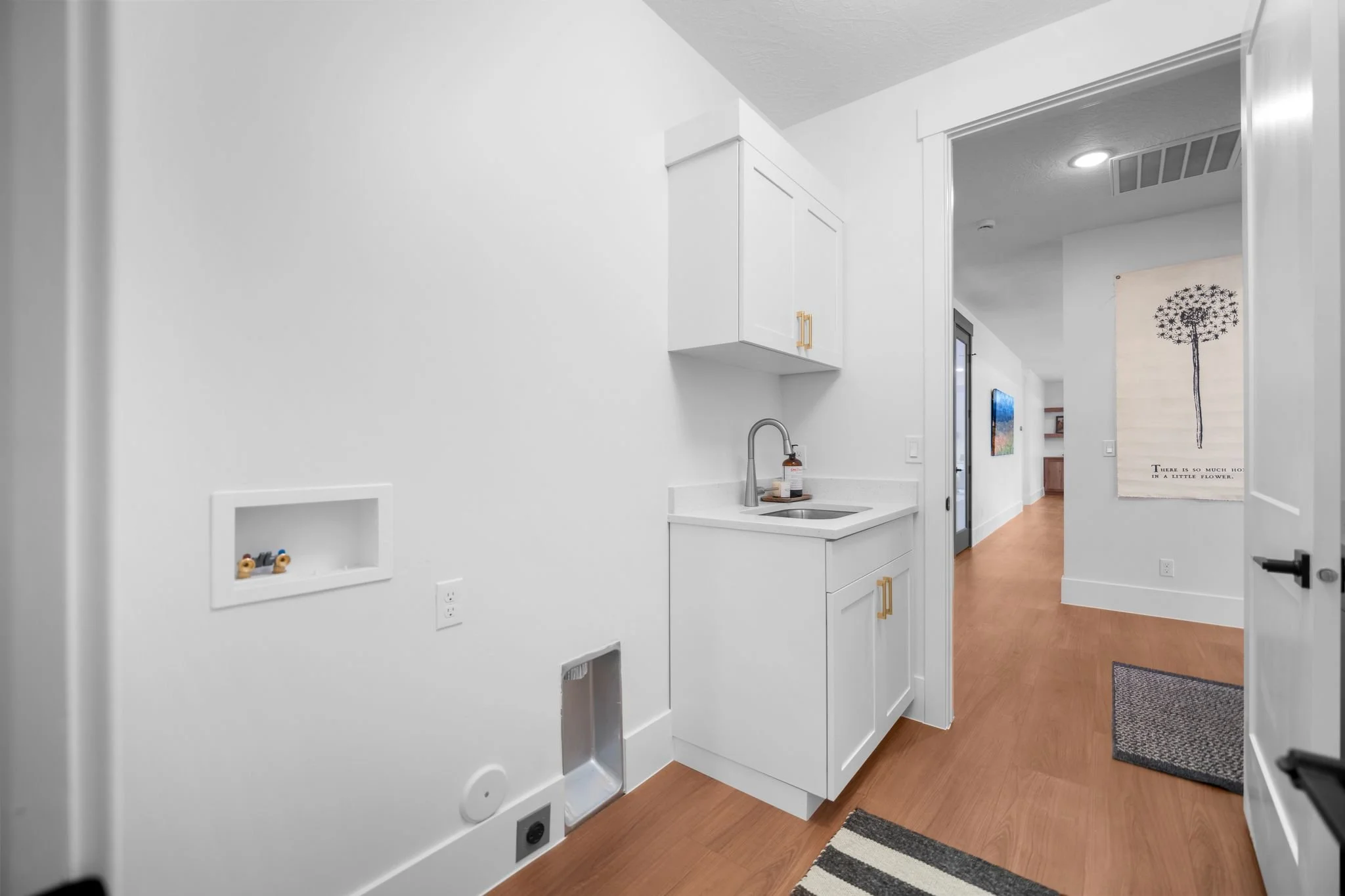 The large laundry room is equipped with a sink and cabinets for all your laundry needs and can be accessed through both the master bedroom and the mud room.