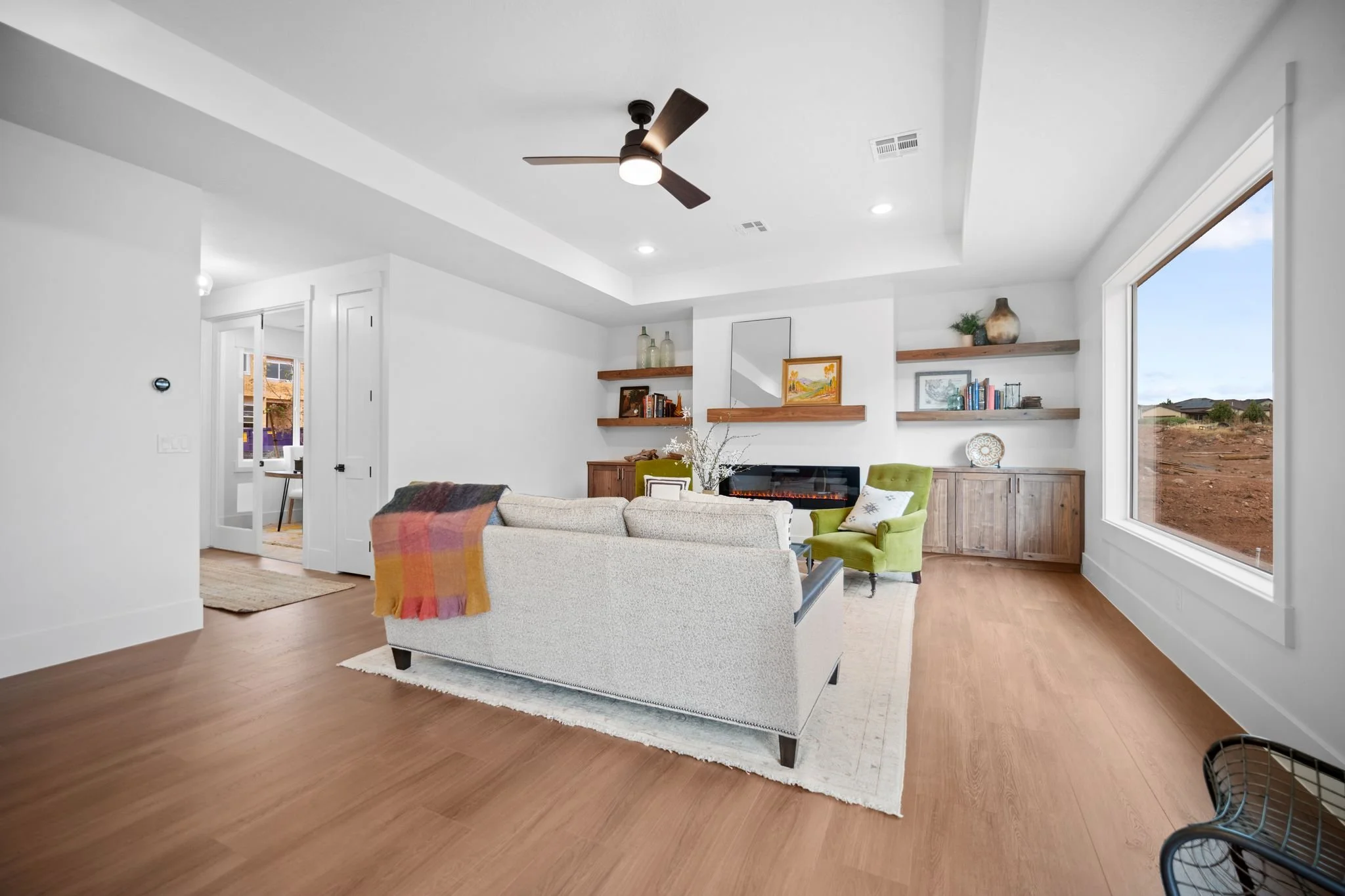 Step into the heart of the home where the kitchen seamlessly flows into the showstopper great room with its tray ceiling and large windows flooding the space with natural light. The fireplace, surrounded by custom built-in walnut shelving and cabinetry adds a touch of warmth and sophistication.
